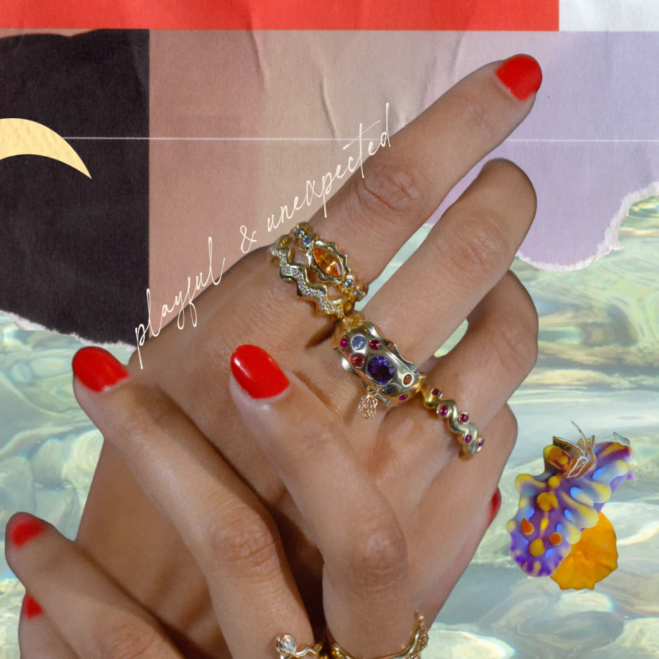 This dramatic statement sapphire design features a range of hues, making it bright and bold. Due to the width of this design, we recommend sizing up a full size.