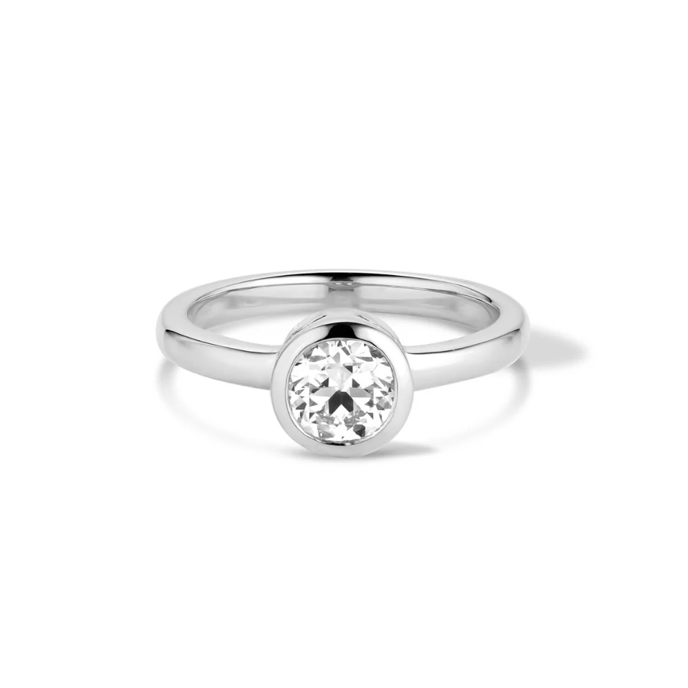 This bezeled beauty of an engagement ring features a sparkly lab .75ct diamond surrounded by solid 14k gold with wavy cutouts along the basket of the ring to let a little light inside the bezel.