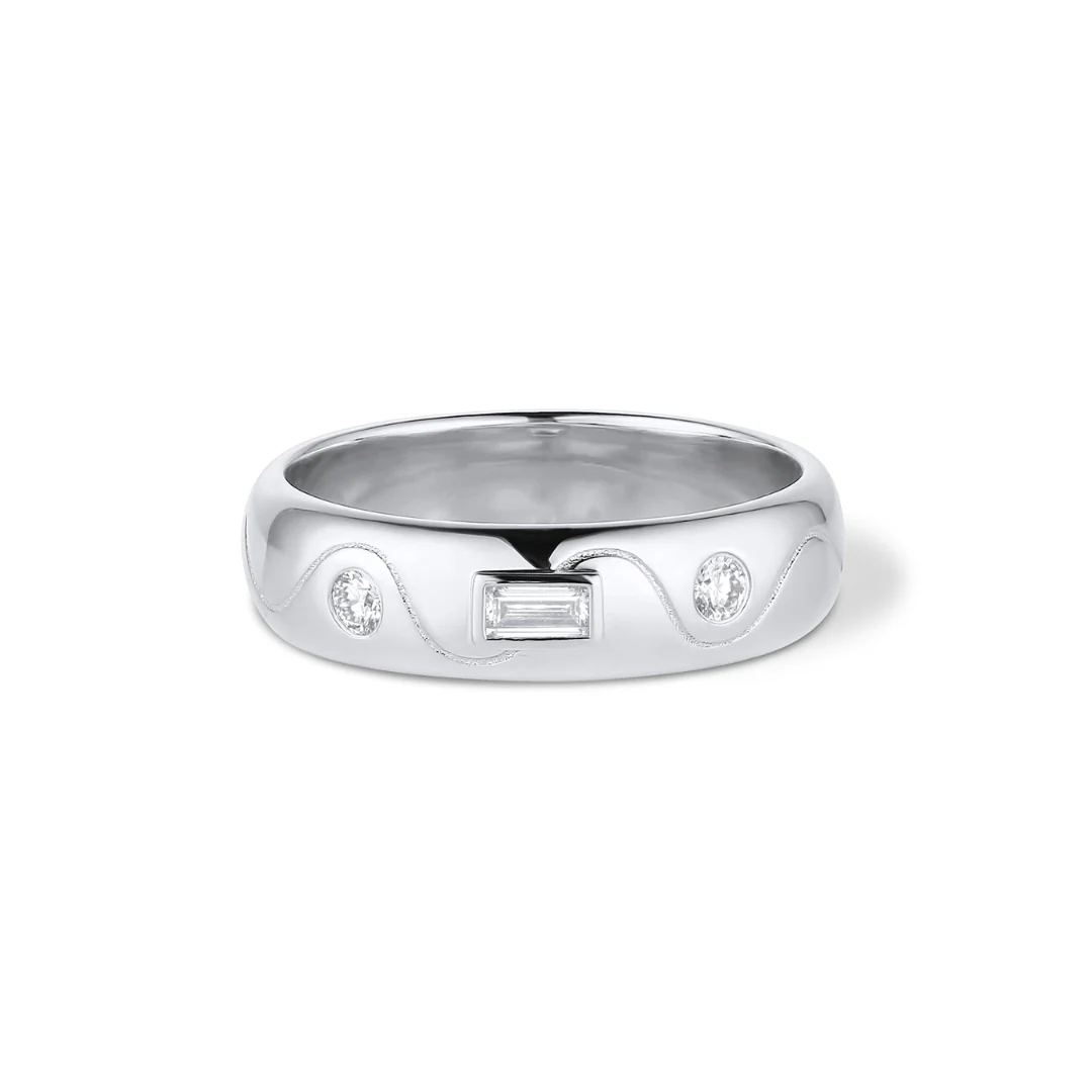 For both the men and anyone who loves something funky and unexpected, our Roam diamond baguette band is the perfect wedding band for those looking for a thicker wedding band design.