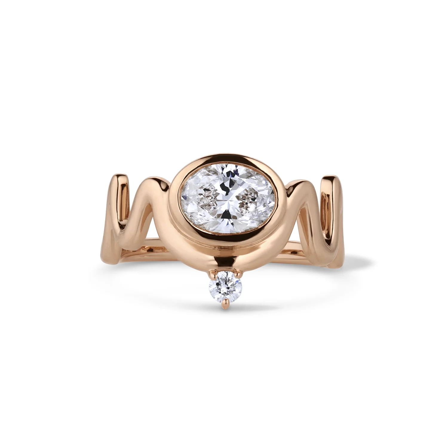 This eye-catching oval engagement ring is part of our permanent engagement collection and features a 1ct oval white diamond bezel set in this wavy band design. (It also stacks perfectly with our Ripple Bands!)